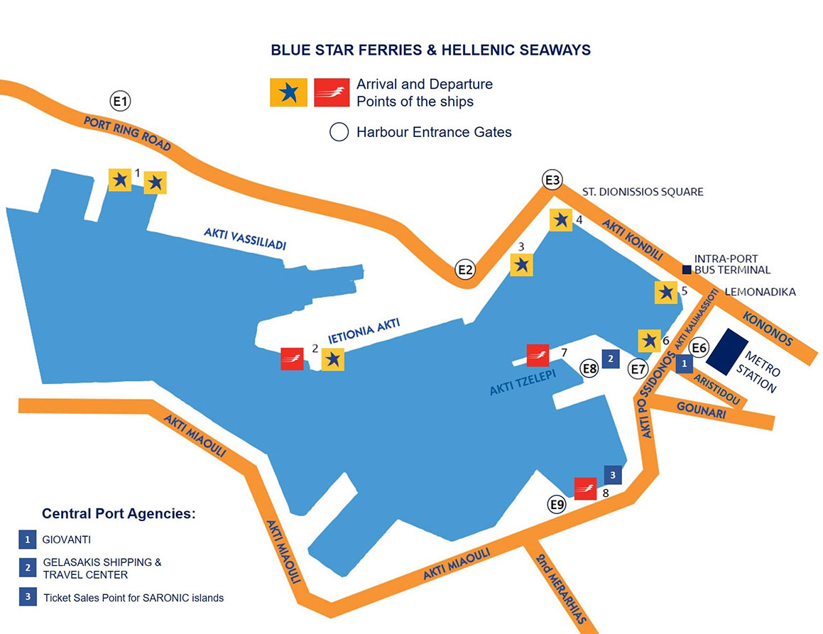 Point of ships' arrival and departure for Saronic Gulf islands: Aegina-Agistri and Poros-Hydra-Ermioni-Spetses-Porto Heli. Port Gate Ε8.